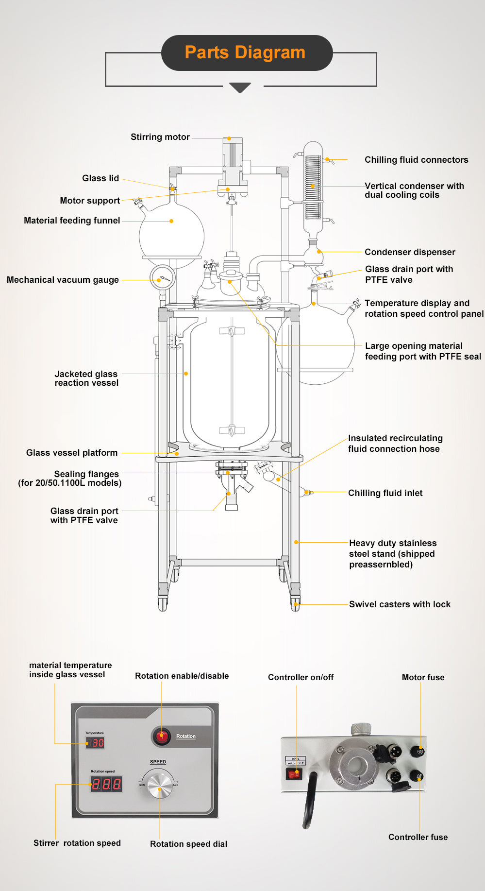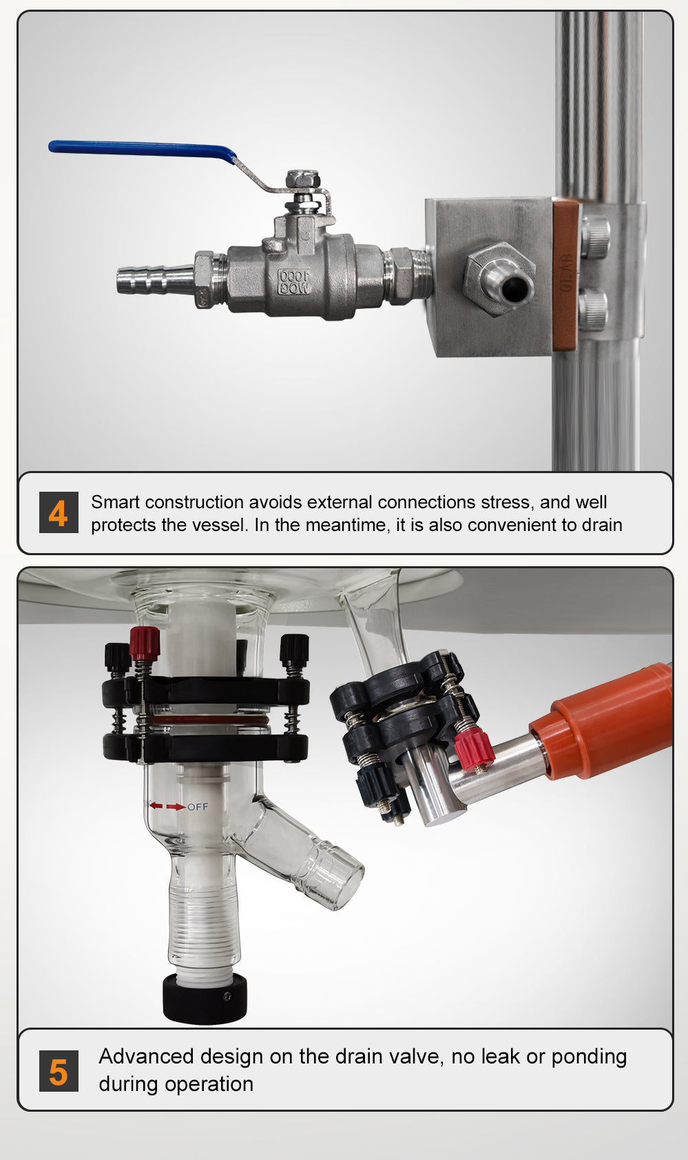 WT-R series single and dual jacketed glass reactors are designed for synthetic reactions of different materials while under a controlled temperature and vacuum environment. Each reactor features adjustable stirring speeds and a constant pressure feeding funnel, which allows you to add material to the vessel at a uniform and controlled speed. The built-in condenser makes it possible to recover some materials, also at a controlled rate of speed.