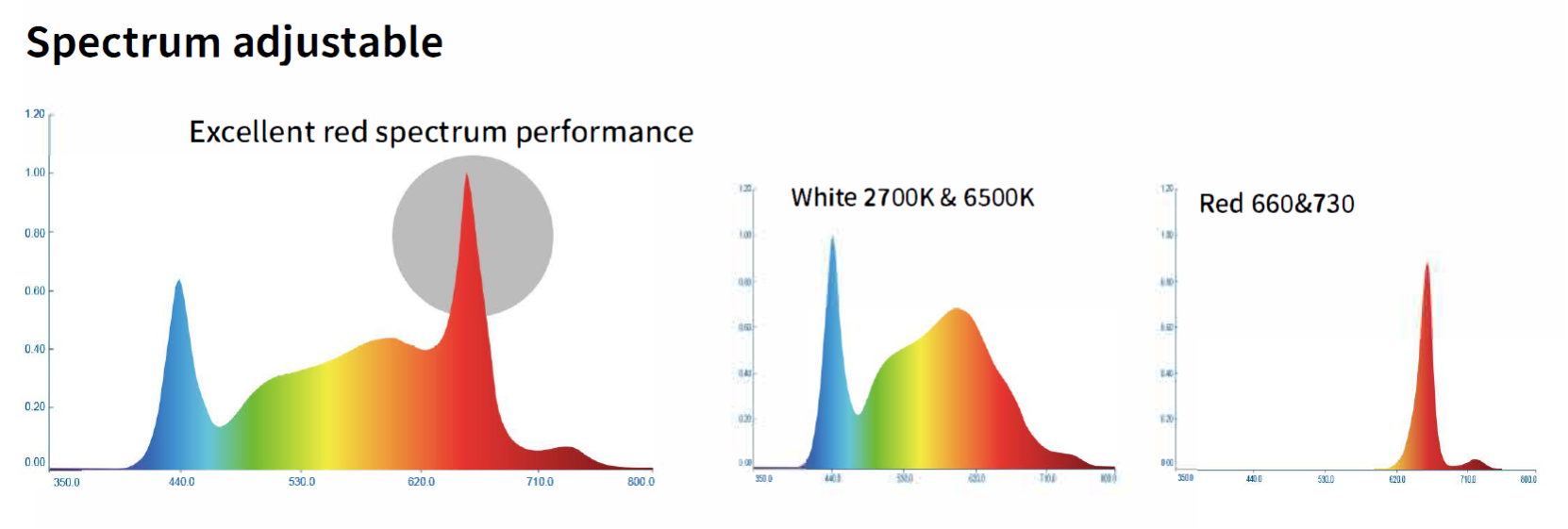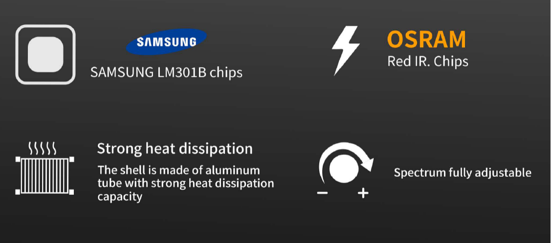 | Spectrum | Full spectrum white (cool & warm) with 660nm & 730nm red |